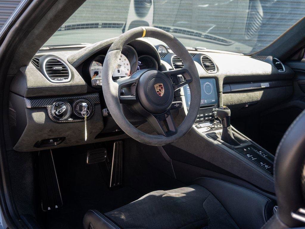 Arctic Grey 2023 Porsche 718 Cayman GT4 RS RWD 7-Speed Porsche Doppelkupplung (PDK) 4.0L H6 DOHC 24V LEV3-ULEV125 493hp Row Cage, BOSE Surround Sound System, Chrono Package, Door Handles in High Gloss Black, Fire Extinguisher, Illuminated Door-Sill Guards in Carbon Fiber, Instrument Dials in White, Light Design Package, Luggage Net in Passenger Footwell, Med 3D-Printed Bodyform Full Bucket Driver's Seat, Porsche Ceramic Composite Brakes, Seat Belts in Deep Sea Blue, Smoking Package, Sport Chrono Stopwatch or Compass Dial in White, Storage Compart Lid in Race-Tex w/PORSCHE Logo, Sun Visors in Race-Tex, Weissach Package, Wheels Painted in Satin Neodyme, Wheels: 20" 718 Cayman GT4 RS Forged Aluminum, Wheels: 20" 718 Cayman GT4 RS Forged Magnesium, Window Triangle Trims in Carbon Fiber.